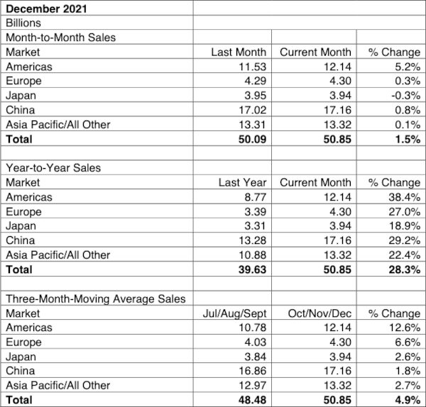 Three-month average of chip sales by geographic region for December and November 2021. Source: SIA/WSTS.