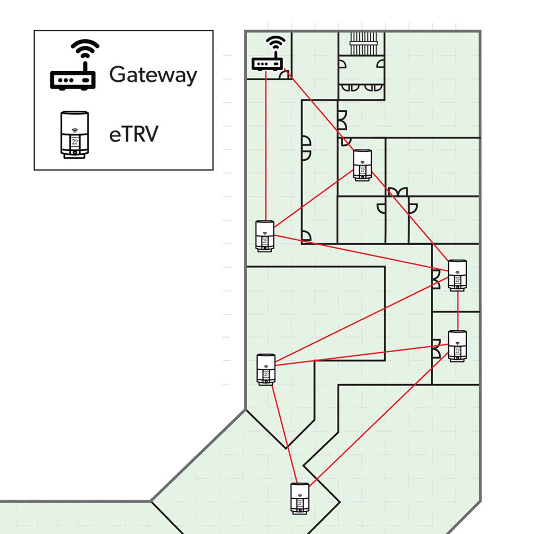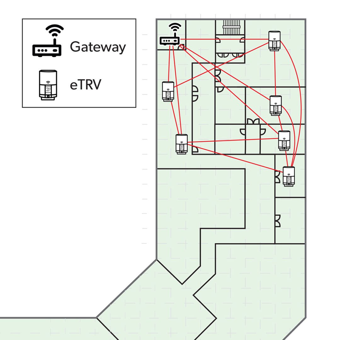 In order to equip large buildings, such as commercial or industrial buildings or multi-family apartment buildings, with smart eTRVs, the wireless communication protocol employed must be able to support several hundreds of devices in the same network. Packet loss must be low or almost absent, and all eTRVs must be able to communicate bidirectionally with a gateway. Further, the eTRVs must be able to operate on batteries for years, and installation must be fast and simple without risk of having poorly connected eTRVs. Finally, the network must be resilient to changes in the building, such as new or moved walls, increased furniture and interference from other wireless systems.