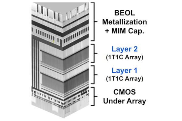 The memory includes a 5.7nm ferroelectric capacitor as the charge retention device within the 1T1C architecture of a traditional DRAM. The memories are stacked with dual-gated polycrystalline silicon transistors as the access control devices.