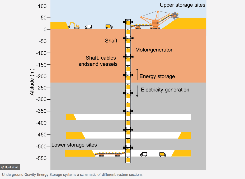 UGES generates electricity when the price is high by lowering sand into an underground mine and converting the potential energy of the sand into electricity via regenerative braking and then lifting the sand from the mine to an upper reservoir using electric motors to store energy when electricity is cheap. The main components of UGES are the shaft, motor/generator, upper and lower storage sites, and mining equipment. The deeper and broader the mineshaft, the more power can be extracted from the plant, and the larger the mine, the higher the plant’s energy storage capacity.
