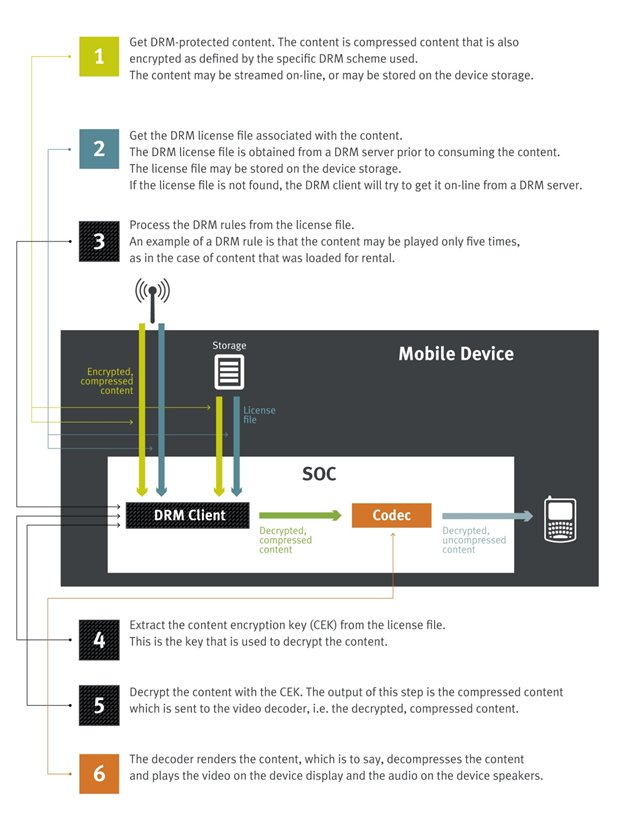 The DRM flow described above illustrates the elements of the system that must be protected in a secure DRM system, i.e. the DRM assets.