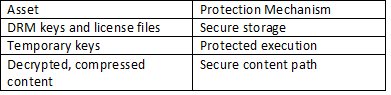 Having defined the list of DRM assets that must be protected and the list of attacks against which they must be protected, we can summarize the mechanisms used to protect the assets. The following table summarizes the protection mechanisms used to protect the assets.