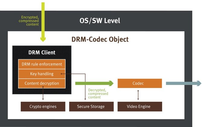 Although decrypted, compressed content must be protected, its protection has normally been considered out of scope for DRM requirements, or at most, has been considered a “soft” requirement. However, as noted above in the introduction, we have recently seen a push for high-security DRM implementations. The meaning of high security is exactly the added focus to protect decrypted, compressed content as a strict requirement.