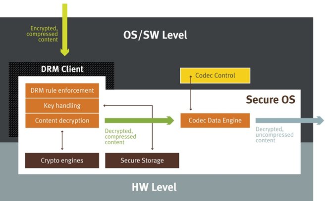 For premium content that requires high bandwidth, a hardware codec is normally used in the solution. The hardware data engine of the codec is secured by placing it in the TEE. The codec control code may run over the main OS.