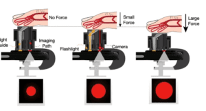 The system, called BPClip, is based on the scientific premise of measuring oscillometry at the fingertip to measure blood pressure. To enable a smartphone to measure the pressure applied to the digital artery, a moveable pinhole projection moves closer to the camera as the user presses down on the clip with increased force. As a user presses on the device with increased force, the spring-loaded mechanism compresses. The size of the pinhole thus encodes the pressure applied to the finger. In conjunction, the brightness fluctuation of the pinhole projection correlates to the arterial pulse amplitude. By capturing the size and brightness of the pinhole projection with the built-in camera, the smartphone can measure a user’s blood pressure with only a low-cost, plastic clip and an app.