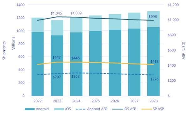 Global Android and iOS smartphone shipments 2022 to 2028 . Source: IDC.